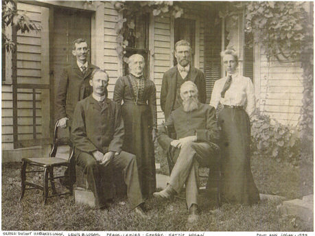 Lewis B. Logan family of Gustavus, Ohio Seated: Dwight Hotchkiss Logan, Lewis B. Logan b 28 Jan 1826. Satnding: Frank Osmon Logan, Lemira Logan, George Miner Logan, and Hattie Logan Lobaugh