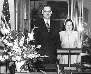 This photo shows my Great Aunt Arvadia Harclerode Burbank with her husband, William C. Burbank. Mr. Burbank was Mayor of Warren, Trumbull County, OH from 1952-1959. This photograph was taken in 1952 at Warren's City Hall, inside the Mayor's Office. William Burbank was sworn in as Mayor just before this photo was taken. The city of Warren went forward in many areas under his administration. The Water Filtration Plant and a gigantic sewer program were completed. The Packard Music Hall was built. A program of repairing and widening streets were started during his administration. Commercialized vice and gambling were banished. Organized crime was elimated form Warren. Land was side aside for recreational parks in sections of the city including Veteran's Park and Burbank Park. Warren was nationally recognized as the "All American City for 1954" by Look Magazine.Bill Burbank died in 1972. |